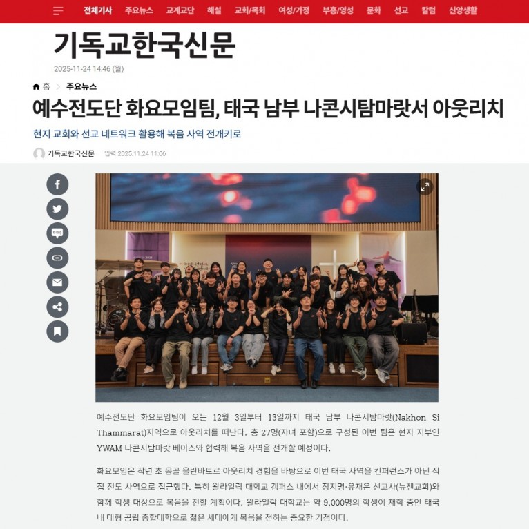 [기사] 예수전도단 화요모임팀, 태국 남부 나콘시탐마랏서 아웃리치(기독교한국신문)